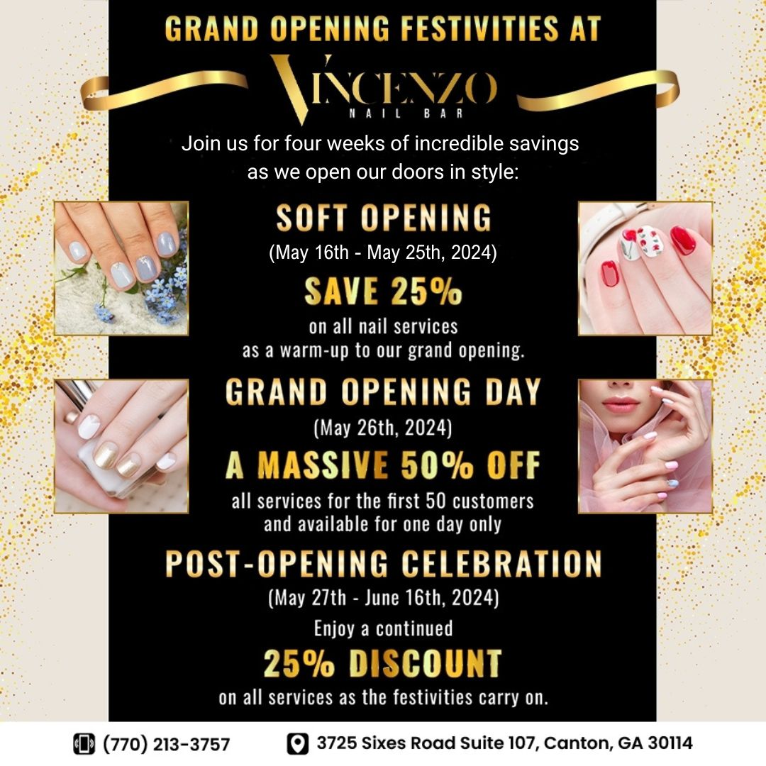 Exciting news awaits as we celebrate our journey together! Join us for our Soft Opening from May 16th to May 25th, 2024, where you can enjoy a special promotion of 25% off on all services as a warm-up to our grand event. But wait, there's more! On May 26th, 2024, mark your calendars for our Grand Opening Day extravaganza, where the first 50 customers will receive a jaw-dropping 50% off all services—for one day only! And the celebration doesn't end there; from May 27th to June 16th, 2024, continue the festivities with 25% off all services during our Post-Opening Celebration.